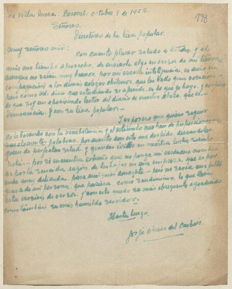 Carta, 1952 octubre 8 [manuscrito] Jorge Obrero del Carbón.