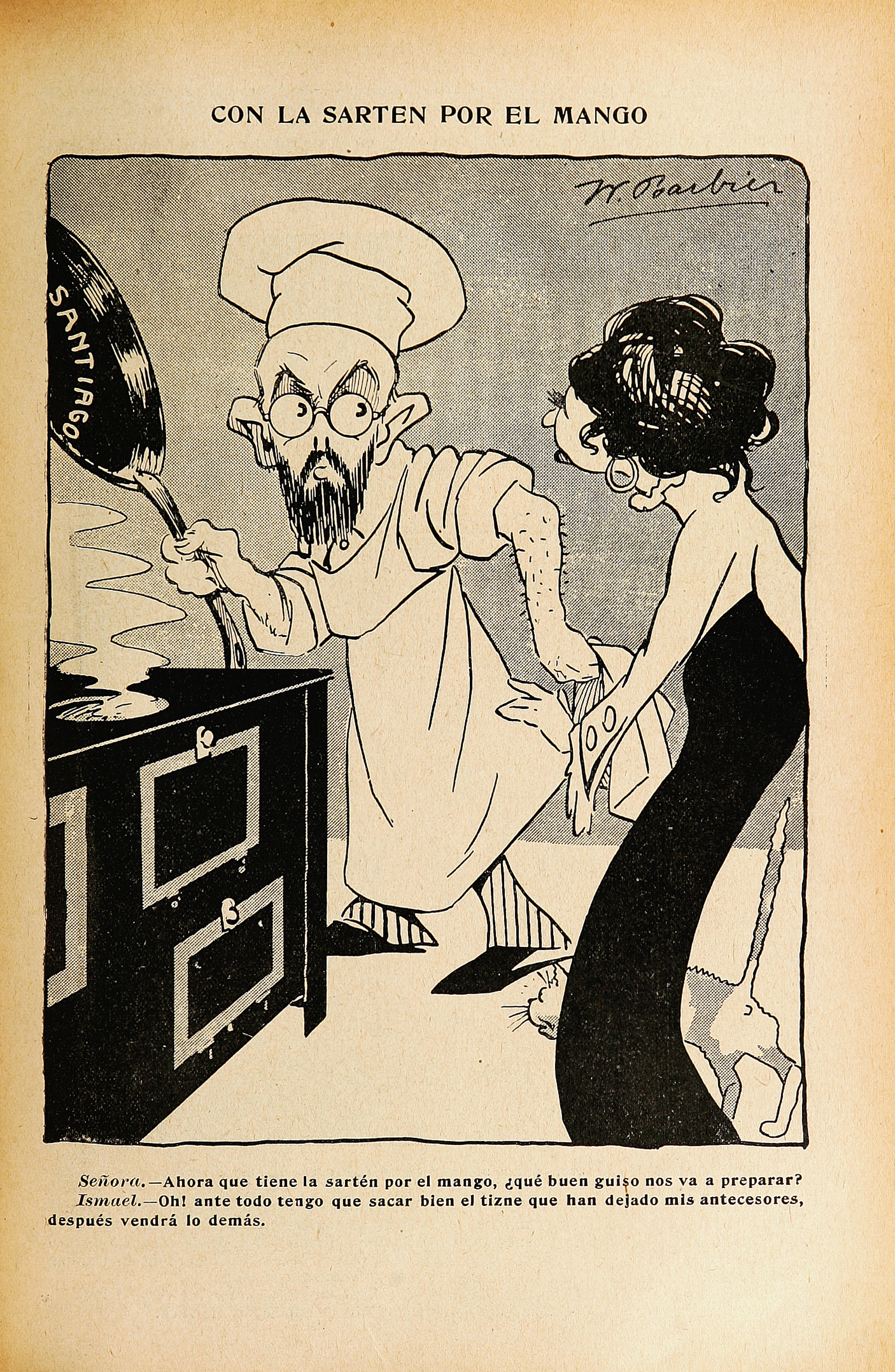 "Con la sarten por el mango"Ilustración extraída de: Sucesos. Valparaíso: editorial no identificada, 1902-1932 (Valparaíso: Universo), 32 volúmenes. Año XI, número 557 (8 de mayo de 1913), página 15