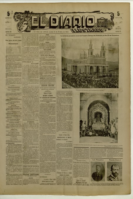 El diario ilustrado. No. 276, 5 de enero de 1903PE0001129 - PE0001130 - PE0001131 - PE0001132 - PE0001133 - PE0001134 - PE0001135 - PE0001136 - PE0001137 - PE0001138 - PE0001139 - PE0001158 - PE0001159 - PE0001033 - PE0001034 - PE0001035 - PE0001074 - PE0001113 - PE0001128El Diario Ilustrado es considerado una fuente invaluable para quienes buscan estudiar la transformación de la sociedad chilena durante el siglo XX, sus debates ideológicos y su cultura visual. Fue publicado durante casi siete décadas, entre 1902 y 1970. Las digitalizaciones que están ahora disponibles en la BNd corresponden a los ejemplares de sus primeros seis años, publicados entre 1902 y 1908.