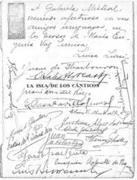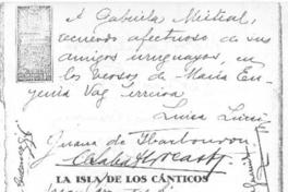 Portada de libro de poemas con firmas de escritores uruguayos, dedicada a Gabriela Mistral. Se distingue la firma de Juana de Ibarbourou.