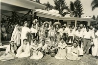 Muestra a un grupo de jóvenes no identificadas posando en trajes típicos mexicanos, y detrás de ella otras personas no identificadas que participan en la ceremonia de inauguración del "Jardín de niños Gabriela Mistral" en Fortín, Veracruz (México).