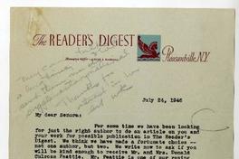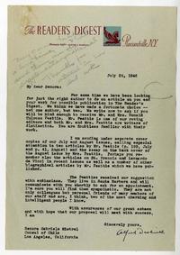 Informan a Gabriela Mistral que los señores Peatties se comunicaran, para ver los detalles de un artículo sobre ella que desean publicar en The Reader's Digest.