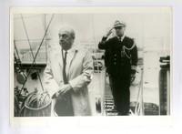 Pablo Neruda en el buque Escuela Esmeralda [fotografía]. París, Francia : [Producción no identificada], 1971. 1 fotografía : Monocromo en blanco y negro, 24,3 x 18 cm. .