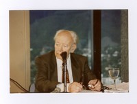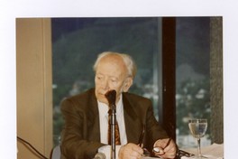 Humberto Díaz-Casanueva durante una presentación [fotografía]. Santiago, Chile : [Producción no identificada], cerca de 1985. 1 fotografía : Color, 12,6 x 8,9 cm. .