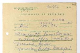 Copia del certificado de Nacimiento de Braulio Arenas, del año 1913, emitido en La Serena en 1972 -- Recuerdo de la Primera Comunión, en la Iglesia de San Francisco de la Serena en 1924.