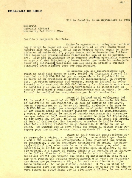 [Carta] 1946 sep. 21, Río de Janeiro [a] Gabriela Mistral, Monrovia, California [manuscrito] Alejandro Bertrand.