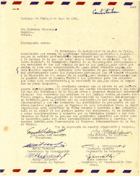 [Carta] 1951 ago. 23, Santiago, Chile [a] Gabriela Mistral, Nápoles, [Italia] [manuscrito] Olga Poblete de Espinosa, Guillermo del Pedregal, Santiago Aguirre.