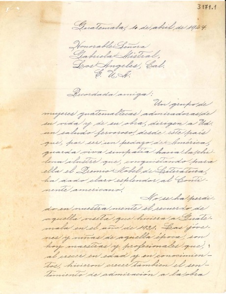 [Carta] 1947 abr. 10, Guatemala [a] Gabriela Mistral, Los Angeles, California, [EE.UU.] [manuscrito] Graciela Juan de Reina ... [et al.].