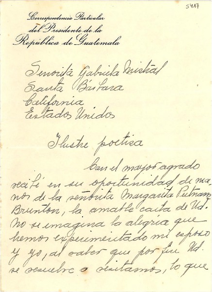 Mistral, Gabriela - Autores guatelmatecos - Girón Cerna, Carlos - Manuscritos guatemaltecos - Correspondencia