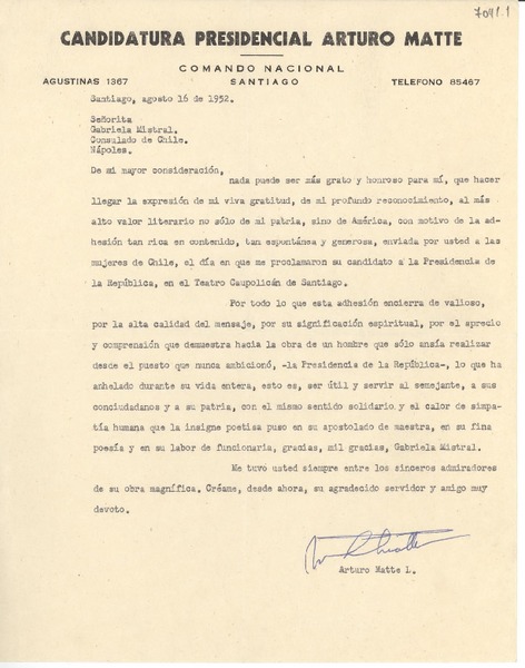 [Carta] 1952 ago. 16, Santiago [a] Gabriela Mistral, Nápoles [manuscrito] Arturo Matte L.