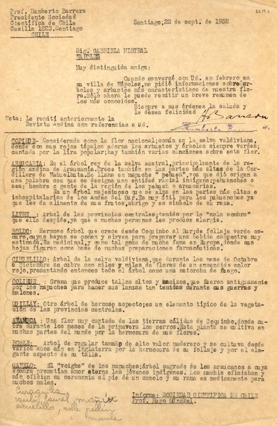 Barrera Valdebenito, Humberto - Correspondencia - Mistral, Gabriela - Manuscritos chilenos