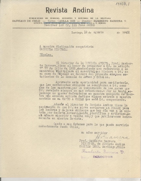 [Carta] 1952 ago. 12, Santiago, [Chile] [a] Gabriela Mistral, Nápoles [manuscrito] Humberto Barrera.