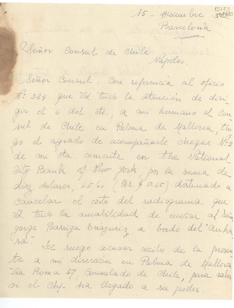 [ Carta] 1952 dic. 15, Barcelona, [España] [a] Señor Cónsul de Chile, Nápoles [manuscrito] Isabel Cosmelli de Sotomayor.