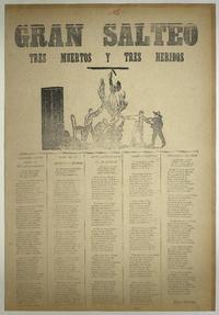 Gran salteo : tres muertos y tres heridos / Pepa Aravena. [Chile] : [Impresor no identificado], [1895?] 1 hoja : ilustraciones ; 56 x 38 cm. .