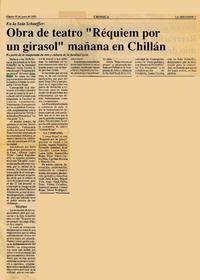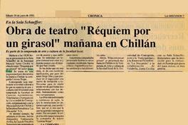 Obra de teatro "Réquiem por un girasol" mañana en Chillán [artículo]. La Discusión. -- jun. 20, 1992, p. 7. .