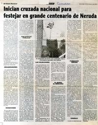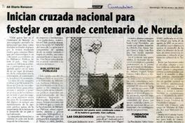 Inician cruzada nacional para festejar en grande centenario de Neruda. [artículo] Diario Renacer (Curanilahue, Chile)-- ene. 18, 2004, p. A8. retr. .