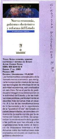 Nueva economía, gobierno electrónico y reforma del Estado [artículo] / Eugenio Rivera Urrutia. Las Últimas Noticias (Diario : Santiago, Chile)-- dic. 2003, p. 31. .