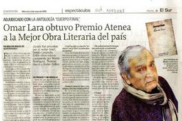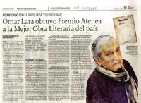 Omar Lara obtuvo premio Atenea a la mejor obra literaria del país [entrevista] [artículo] / Sebastián Gran del Río. El Sur (Diario : Concepción, Chile)-- mayo 6, 2015, p. 23. .