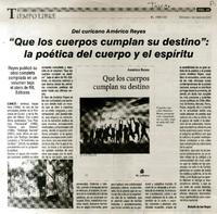 "Que los cuerpos cumplan su destino": la poética del cuerpo y el espíritu [artículo] / Rodolfo de los Reyes. El Centro (Diario : Talca, Chile)-- ene. 2, 2013, página 25 (suplemento "Tiempo Libre") .