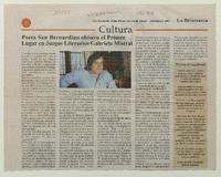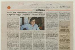 Poeta San Bernardino obtuvo el primer lugar en juegos literarios Gabriela Mistral [entrevista] : [artículo] La Diferencia ( Diario : San Bernardo, Buin, Paine, Calera de Tango, Chile)-- nov. 2002, p. 8. retr. .