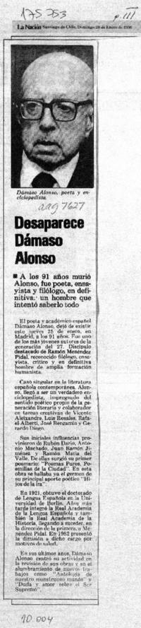 Desaparece Dámaso Alonso. [artículo] La Nación (Diario : Santiago, Chile)-- ene. 28, 1990, p. III. .