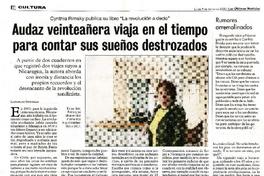 Audaz veinteañera viaja en el tiempo para contar sus sueños destrozados Cynthia Rimsky publica su libro "La revolución a dedo" [artículo] : Leonardo Sanhueza.