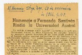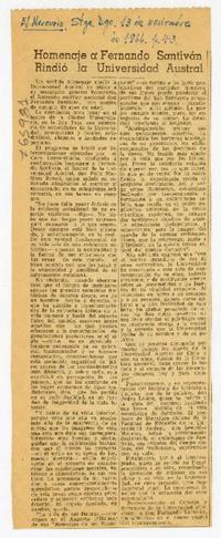 Homenaje a Fernando Santiván rindió la Universidad Austral [artículo] El Mercurio (Diario : Santiago, Chile)-- nov. 13, 1966, p. 43. .