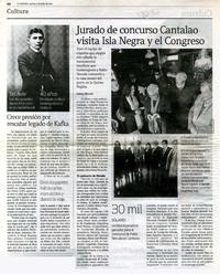 Jurado de concurso Cantalao visita Isla Negra y el Congreso [artículo] / Rodrigo Miranda. La Tercera (Diario : Santiago, Chile)-- jul. 10, 2008, p. 44 1 página : ilustracones en blanco y negro ; 42 cm. .