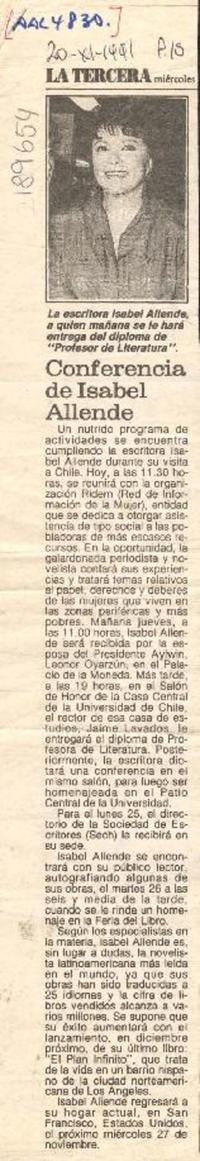 Conferencia de Isabel Allende [artículo] La Tercera (Diario : Santiago, Chile)-- Noviembre 20, 1991, página 15. 1 página : ilustraciones en blanco y negro ; 32,5 cm. .