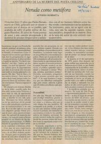Neruda como metáfora / Antonio Skármeta -- El amor secreto de Neruda / Rosa María Pereda -- Pablo Neruda (ilustraciones) / God dag Polen (poema en noruego) / Pablo Neruda -- Hymne til Stalin og hans mænd (Poema en danés) / Pablo Neruda -- Den Usynlige Mand (Poema en danés) / Af Pablo Neruda -- I morgen er det for sent (poema en noruego) / Pablo Neruda -- Demokratiets argumenter er fængsel, Tortur og mord (poema en danés) / Land of Folk, Torsgad den 12 Juli 1951 -- Von Pablo Neruda sind bisher in unserem verlag erschienen (invitación) / Kultura 1960 / Ota Klein -- Allí murió la muerte / Pablo Neruda -- Miguelowi Hernandez. Zamordowanemu w wiezieniach Hiszpanii (poema en polaco, documento mecanografiado) / Lech Pijanowski -- Tam umaria smierc (poema en polaco, documento mecanografiado) / Magyarok Világsozvetsége (telegrama escrito en húngraro) / Ingleterra - EE.UU. / Paul Robeson sings, lectures in first city recital in 11 years / The New York times, 11 may 1958 -- Anthony Wood... More like an ancient bard / Oxford mail, 1 june 1965 -- Poet of another wasteland / by Mary Kenny -- Italia / Rivista Trimistrale "Societa" (comentario) / Jorge Sanhueza -- Torneto nel Cile dopo lunghi viaggi in esilio Pablo Neruda ha scritto: "Le uve e il vento", "Odi elementari", "Viaggi", "Nuove odi elementari" / di Dario Puccini -- Pablo Neruda nella sua residencia cilena all'Isla Negra / Darío Puccini -- L'ultimo Neruda (odas, páginas 3 y 4) / Puccini, Darío -- Francia / Poésie autour du monde Chili : Pablo Neruda, le péon universel / Alice Ahrweiler -- Mon ami est mort / par Pablo Neruda Les raisins de l'Europe / Pablo Neruda -- La poésie de Pablo Neruda / Ilya Ehrenbourg -- La poésie de Pablo Neruda / par Ilya Ehrenbourg -- Hommage á Pablo Neruda / par Gilbert Ancian -- Pablo Neruda est en danger / Louis-Martin Chauffier --