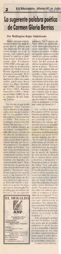 La sugerente palabra poética de Carmen Gloria Berríos [artículo] / Por Wellington Rojas Valdebenito. El Heraldo (Diario : Linares, Chile) Julio 2, 2002, página 2. 1 página : 36 cm. .