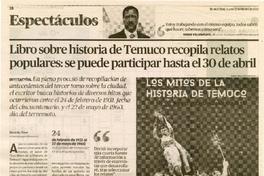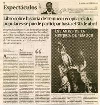 Libro sobre historia de Temuco recopila relatos populares: se puede participar hasta el 30 de abril [artículo] / Ricardo Olave. El Austral (Diario : Temuco, Chile)-- Febrero 21, 2022, página 18. 1 página : ilustración en blanco y negro ; 24 cm. .