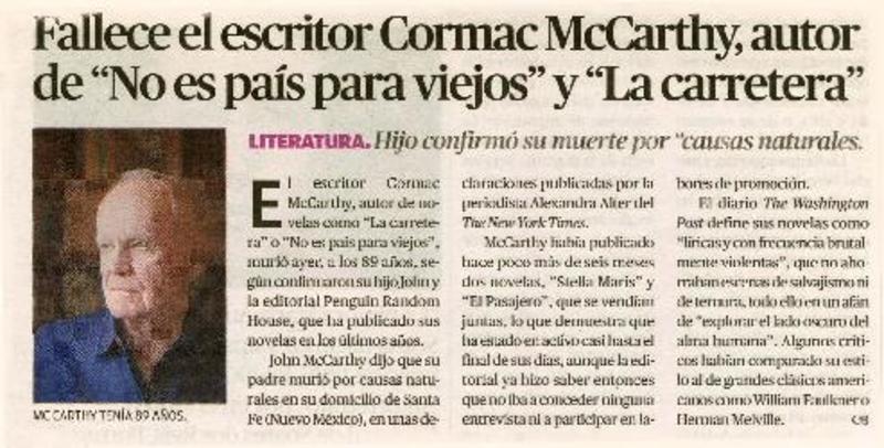 Fallece el escritor Cormac McCarty, autor de "No es país para vienos" y "La carretera". [entrevista] [artículo]