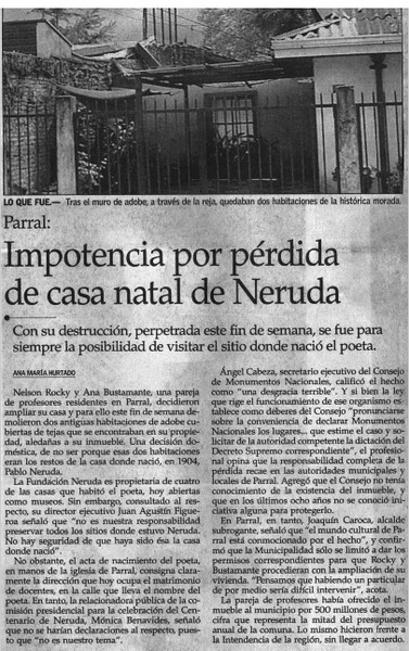 Impotencia por pérdida de casa natal de Neruda [artículo] Ana María Hurtado.