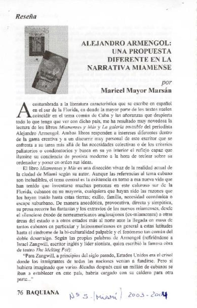 Alejandro Armengol: una propuesta diferente en la narrativa Miamense [artículo] Por Maricel Mayor Marsán.