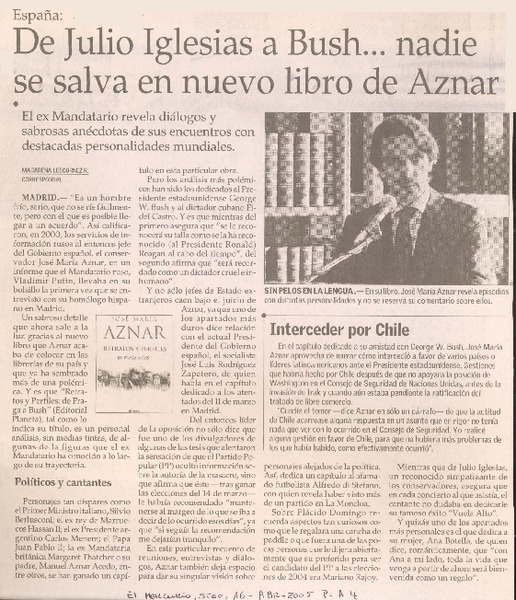 España : de Julio Iglesias a Bush -- nadie se salva en nuevo libro de Aznar [artículo] Macarena Lescornez R.