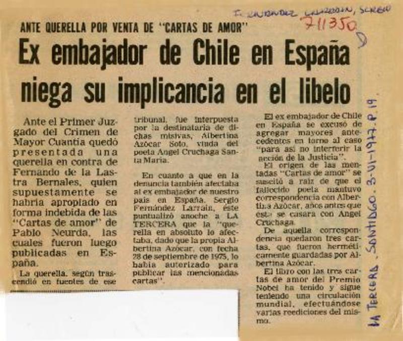 Ex embajador de Chile en España niega su implicancia en el libelo. [artículo]