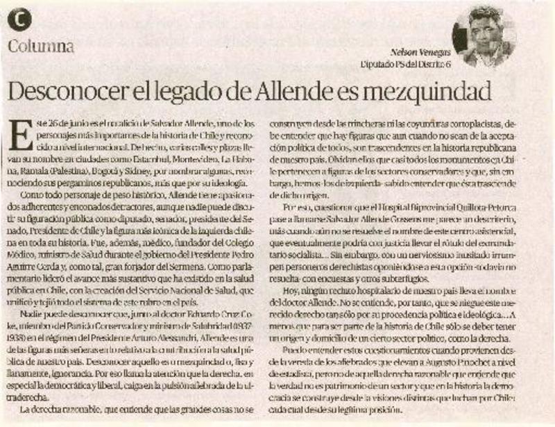 Desconocer el legado de Allende es mezquindad [artículo] Nelson Venegas, Diputado PS del Distrito 6