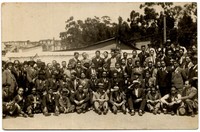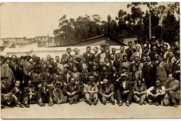 Apróximadamente sesenta hombres sentados y de pie, son retratados al aire libre. Entre las personas del grupo se observa en primera fila a un niño.