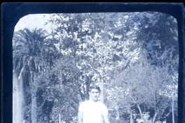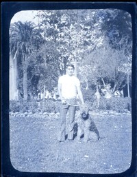 [Joven con un perro en plaza Vergara] [fotografía]. [Viña del Mar, Chile] : [entre 1940 y 1950]. 1 fotografía : negativo sobre papel ; 9 x 7 cm. .