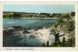 Quintero (Chile) Playa del Quisco [fotografía]. Quintero : [Editor no identificado] , 1960. 1 tarjeta postal : fotografía, policromo gelatina sobre papel ; 13 x 7,7 cm. .