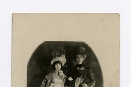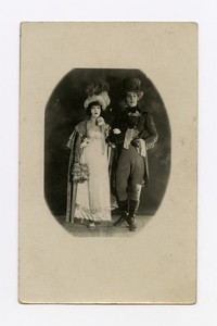 [Pareja vestidos con traje de época para un baile de fantasía] [fotografía] / Fotografía Alvarez. Santiago : Fotografía Alvarez , [Entre 1915 y 1929]. 1 tarjeta postal : fotografía, monocromo, gelatina sobre papel fibra ; 6,3 x 8,3 cm. .
