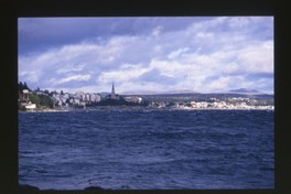 [Costanera; cerros, iglesia y poblado; Región de Magallanes] [fotografía] Jack Ceitelis.