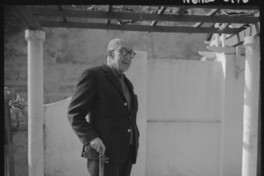 Alberto Romero, [sosteniendo un bastón, en el patio de su casa] [fotografía] / Hans Ehrmann. [Chile] : Hans Ehrmann, [ca. 1965]. Negativo : monocromo, gelatina sobre acetato de celulosa ; 6 X 6 cm. .