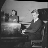 [Ernst Uthoff, toca el piano, una señora a su lado le obseva] [fotografía] Hans Ehrmann.