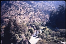 Imágen de la residencia de El Cañaveral, en la precordillera de Santiago de Chile, captada desde un punto elevado. La imagen muestra la casa rodeada de jardines y vegetación, enmarcada por un entorno de cerros y quebradas.