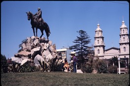 Imagen que muestra el monumento ecuestre al prócer Bernardo O'Higgins, ubicado en la Plaza O'Higgins (esquina de Av. Victoria con Av. Uruguay), Valparaíso. Al fondo se distingue la fachada de la Iglesia de La Merced, la cual estuvo presente frente a la plaza desde mediados del siglo XIX hasta su demolición en 1987.