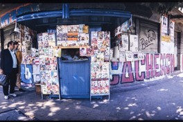 Imagen panorámica que muestra un quiosco de venta de diarios y revistas en una esquina de la ciudad, rodeado de carteles y rayados en muros con consignas políticas. Dos transeúntes observan el quiosco, mientras el vendedor atiende desde su interior. Se distinguen afiches y murales alusivos a candidaturas políticas de la época.