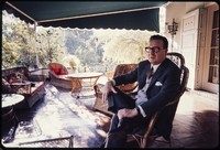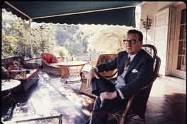 Conjunto de 17 fotografías tomadas en la residencia presidencial de Tomás Moro 200, en Santiago de Chile. Las imágenes muestran a Salvador Allende en un tono formal, sentado en el exterior de la vivienda mientras sostiene una reunión con periodistas. También se aprecia la presencia de personal de servicio de la casa. El registro ofrece un testimonio visual de la interacción del presidente con la prensa en un espacio que, además de residencia, fue también escenario de actividades políticas.