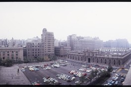 Imágenes que muestran vistas generales del Palacio de La Moneda captadas desde la Plaza de la Constitución. En ellas se aprecia la fachada principal del edificio gubernamental y parte del entorno urbano inmediato a comienzos de la década de 1970